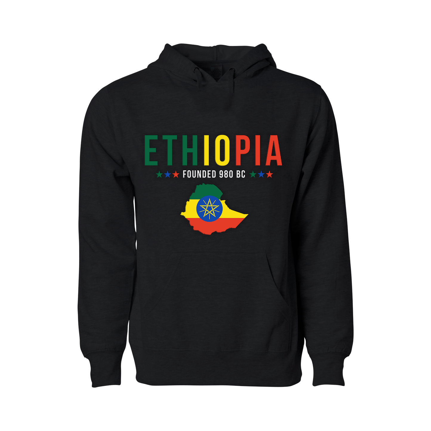 80% cotton 20% polyester blended pullover hoodie with the Ethiopia flag colors embedded into the map of Ethiopia.